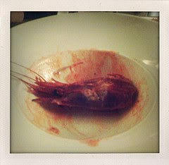 traen cocidito en el plato hondo. A continuación, en una fina botella de vidrio, casi un instrumento de laboratorio, llega la nata caliente que se vierte sobre el animal. Presionas la cabeza y extraes los jugos que se disuelven en la nata. Pelas el carabinero, bañas cada pieza en la nata enrojecida. Tomas la cuchara y terminas la nata.